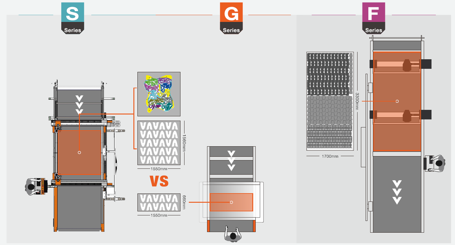 Большинство компаний выбирают режим «2+1+1», который означает: 2 машины серии S для TPU, искусственной кожи и замши, 1 машина серии G для вязаного полотна и 1 машина серии F для технического (инженерного) полотна.