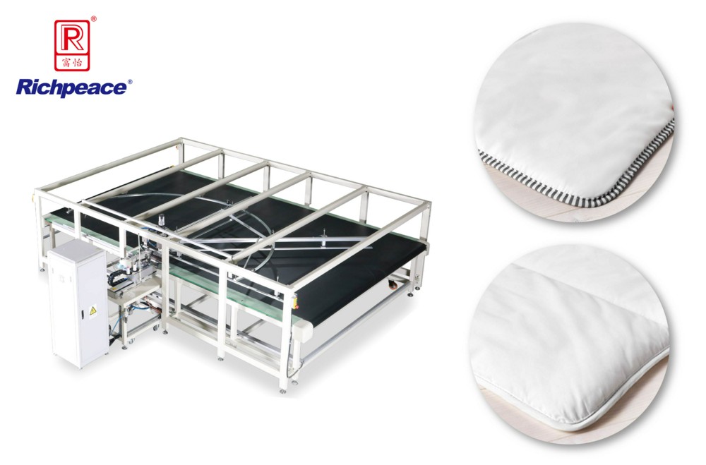 Автоматическая одноигольная машина челночного стежка с электронным управлением, специальной плоскостью для размещения изделий и встроенными устройствами: продвижения и поворота изделий, подрезки и окантовывания срезов. Применение: окантовывание срезов изделий прямоугольной формы: одеял, пледов, покрывал.