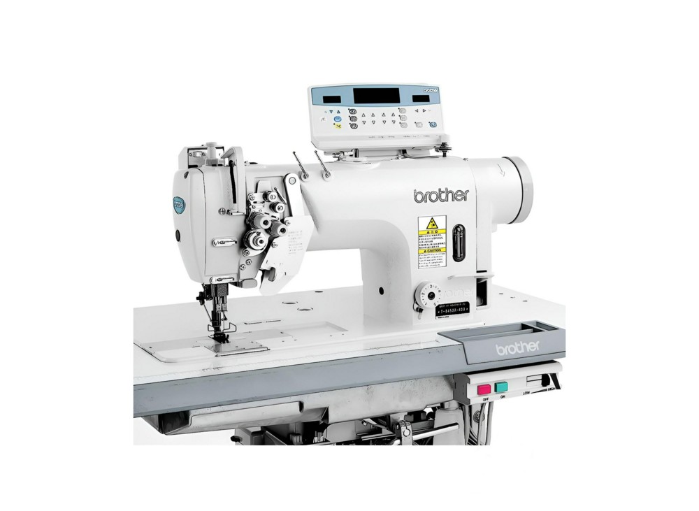 Двухигольная прямострочная машина челночного стежка с игольным и нижним продвижением материалов, с встроенным серводвигателем, электронным управлением автоматическими функциями, увеличенным челноком, без отключения игл