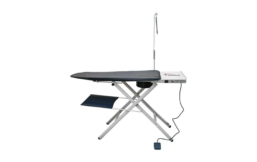 Регулируется по высоте в 3-х положениях, с вакумным отсосом и электрическим подогревом рабочей поверхности. Укомплектованна крепежом и антеной для поддержания электро и парашланга, у доски имеется полноценная подставка для парогенератора, а так же полочка для готовых изделий.