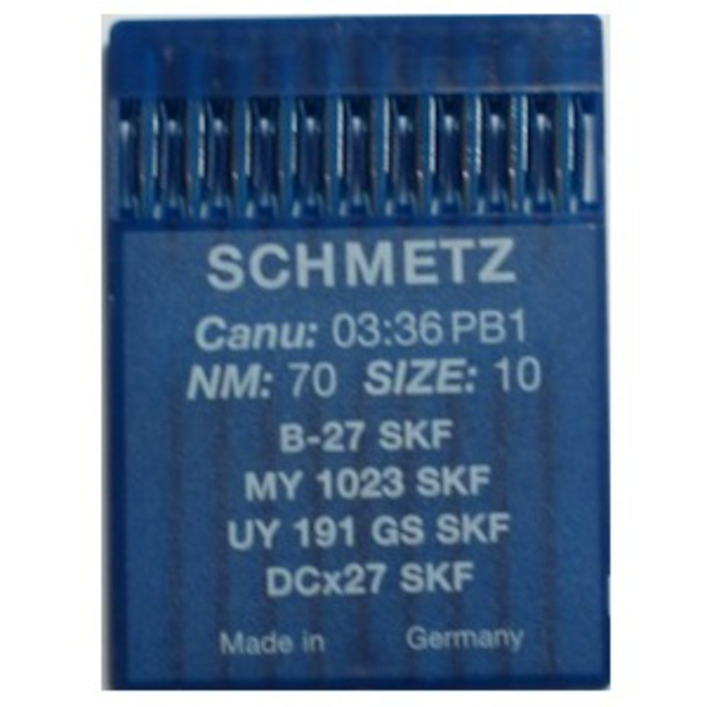 Schmetz DCx27 SKF ( Bx27 SKF) № 70 Модель: 03:36PB1 DCx27 SKF (Bx27 SKF; MY 1023 SKF; UY 191 GS SKF) № 70 Краткое описание: Игла предназначенная для оверлоков. Игла с крупным шарообразным остриём Особо закруглённая форма острия обеспечивает точечное раздвижение обрабатываемого полотна, имеющего грубые, широкие петли, без разрыва нитей. Применение: тонкие эластичные материалы из оплетённых эластомерных нитей, грубый трикотаж. Длина иглы от начала игольного ушка до основания: 28,6 мм. Толщина колбы: 2,02 мм. Толщина иглы (диаметр иглы): 0,70 мм. Количество в упаковке: 10 шт. Производитель: Schmetz (Германия).