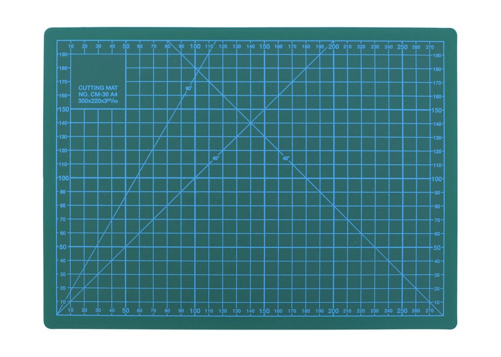 Коврик для раскроя А4 (300х220х3 мм) двусторонний с сеткой в сантиметрах с одной стороны и в дюймах с другой. На обе сетки нанесены линии под углом 45 и 60 градусов.