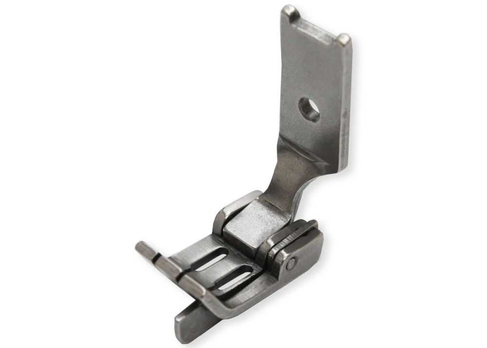 Лапка с правосторонним подпружиненным ограничителем для прокладывания декоративных строчек вдоль шва или края материала. Устанавливается на двухигольные промышленные швейные машины.