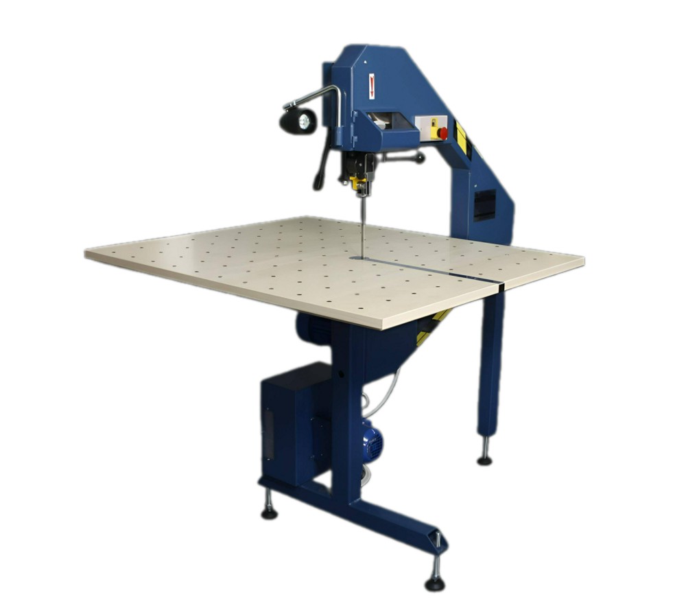 Стационарная ленточная раскройная машина с воздушной подушкой. Предназначена для выкраивания деталей из частей настила, предварительно разрезанного передвижными раскройными машинами. Оснащена заточным устройством, а также надежным механическим ловителем ленты при ее обрыве.