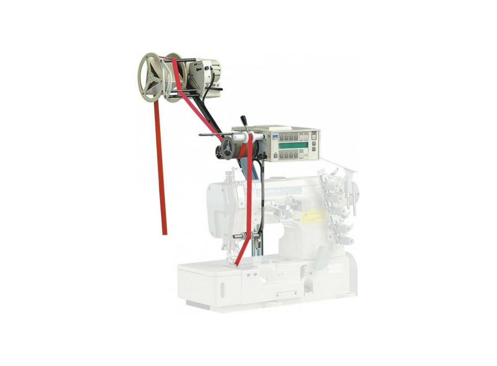 Программируемое устройство подачи эластичной тесьмы сверху компактного типа. Универсальное, монтируется на стол. Программируется по 8 участкам, с автоматической сменой участков, возможность сохранения до 26 программ шаблонов, с последующим вызовом их из памяти устройства.