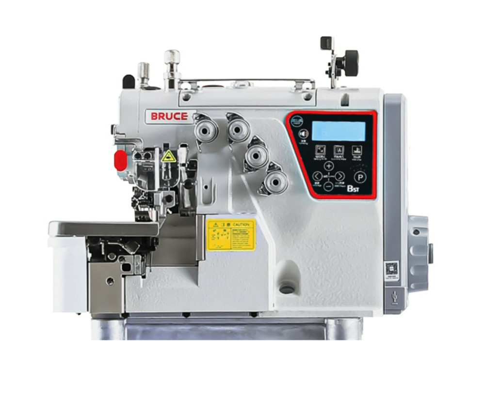Высокоскоростная пятиниточная двухигольная стачивающе-обметочная машина цепного стежка (5-ти ниточный оверлок) с дополнительным верхним продвижением, электронным управлением и автоматическими функциями.