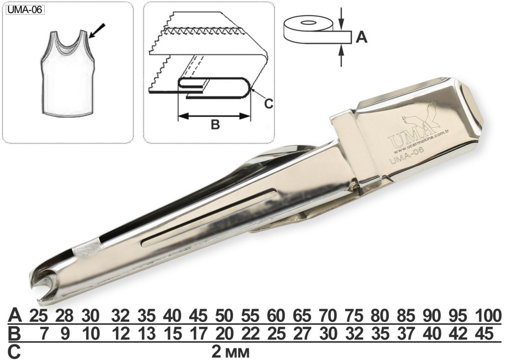 Приспособление UMA-06 для окантовывания срезов горловины бейкой в три сложения. Приспособление устанавливается на плоскошовные машины с вырезом под окантовыватель и подходит для работы с материалами средней толщины.