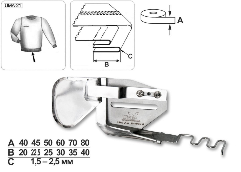 Приспособление UMA-21-A с направителем для выполнения накладного шва с закрытым срезом (с кантом) на плоскошовной машине с плоской платформой.