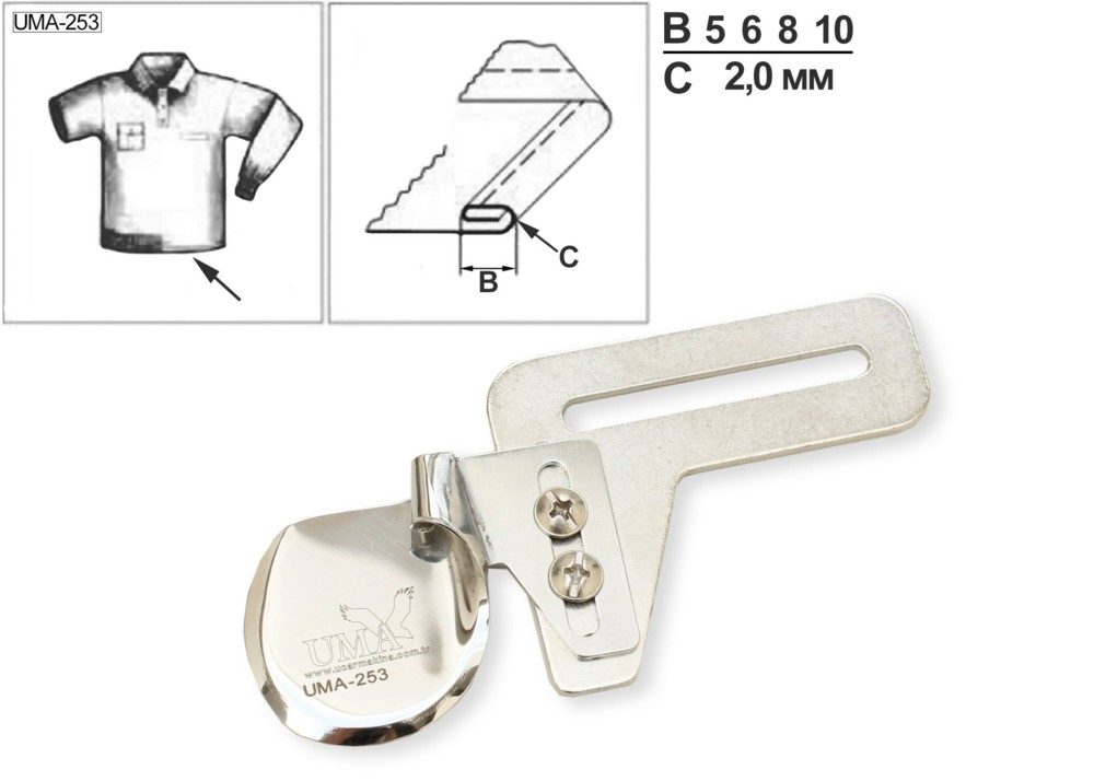 Приспособление UMA-253 для обработки открытых срезов швом вподгибку с закрытым срезом. Край подгибается вверх. Используется при пошиве одежды, подходит для работы с материалами средней толщины.