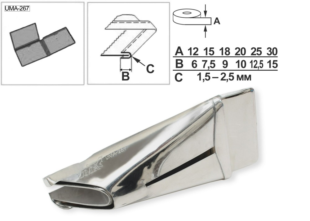 Приспособление UMA-267 для окантовывания деталей из кожи бейкой с открытыми срезами (в 2 сложения). Устанавливается на одноигольные швейные машины с цилиндрической платформой и шагающей лапкой. Подходит для работы со средними и умеренно тяжелыми материалами. Ширина бейки на входе: 60 мм. Ширина бейки на выходе: 30 мм. Толщина материала: 2,5 мм.