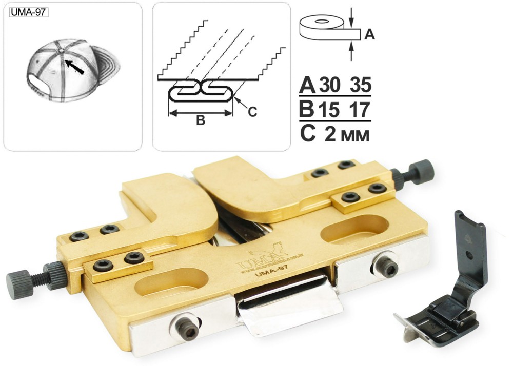 Приспособление UMA-97 для расстрачивания припусков шва с одновременным их закрытием настрочной бейкой с подогнутыми срезами. Приспособление устанавливается на двухигольные швейные машины и подходит для работы с материалами средней толщины.
