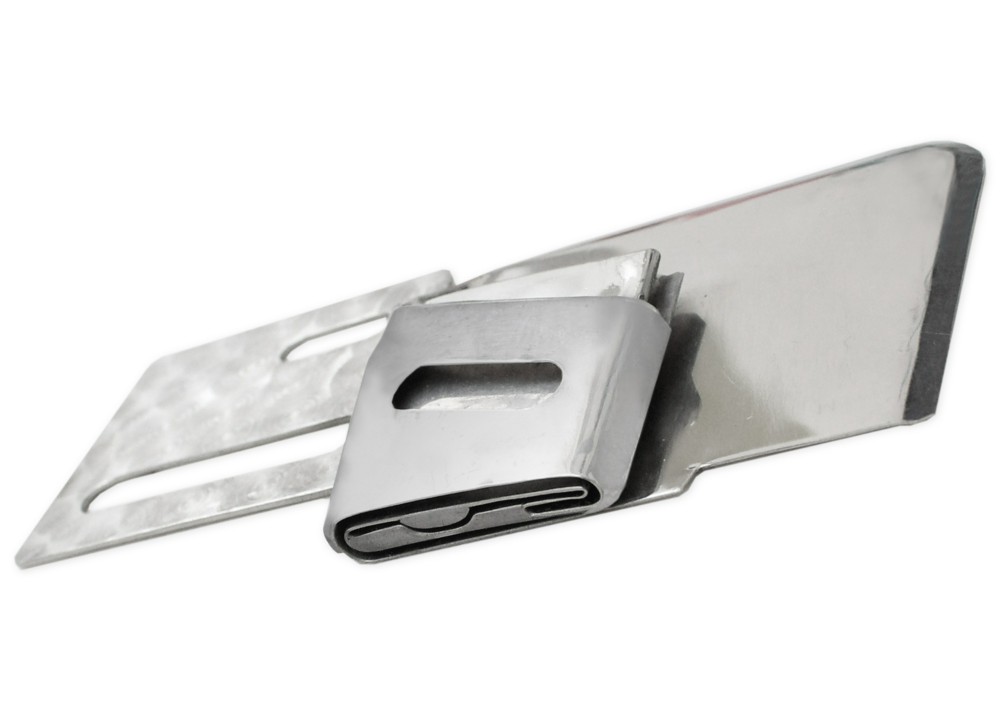 Приспособление KHF42 предназначено для обработки цельнокроеной планки под застежку с одновременным вкладыванием прокладочной полоски. Используется на двухигольных прямострочных швейных машинах.