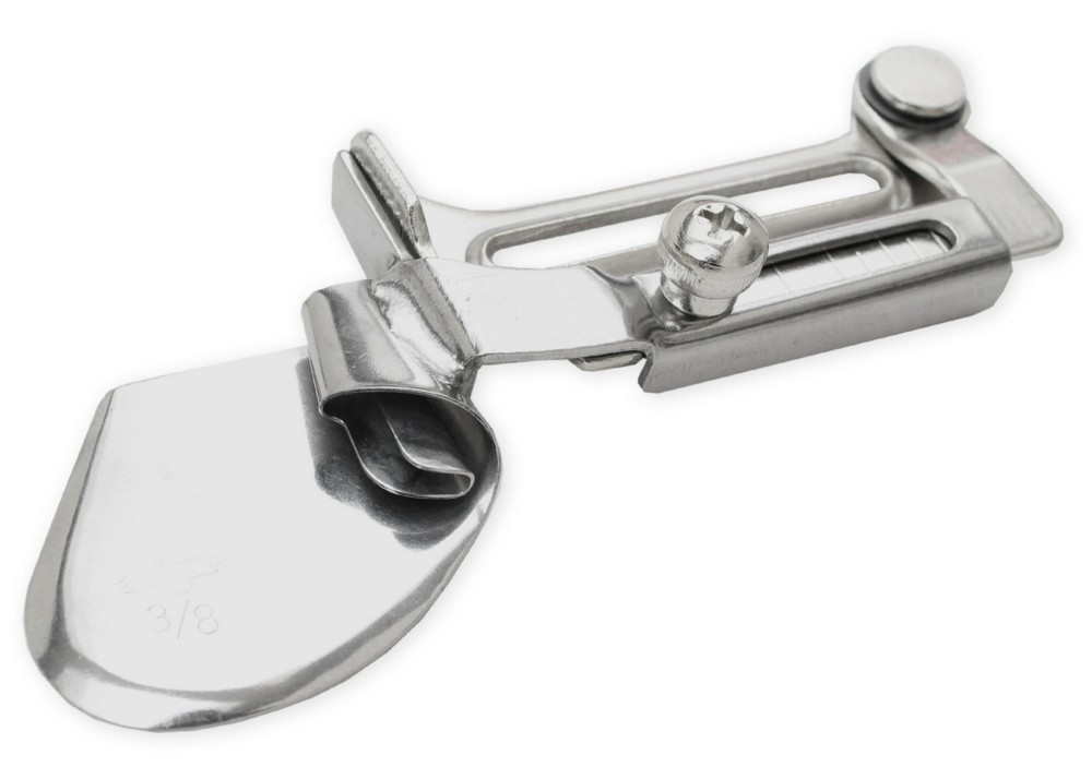 Приспособление KHF9 (улитка) для выполнения шва вподгибку с закрытым срезом (сгиб вверх), на подвижном кронштейне, с регулировкой отступа строчки от сгиба. Устанавливается на промышленные одноигольные швейные машины с плоской платформой.