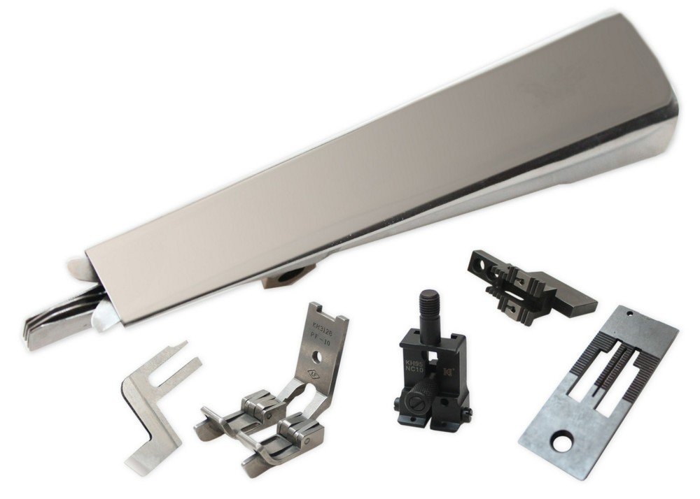 Приспособление KHF 95B (комплект) для обработки кармана в рамку. В комплект входит приспособление без держателя, лапка, игольная пластина, двигатель ткани, иглодержатель и нож.