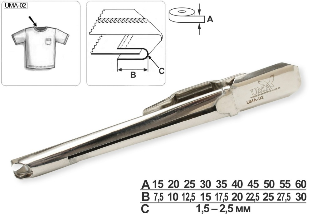 Приспособление UMA-02 для окантовывания открытых срезов горловины и рукавов тесьмой в два сложения.