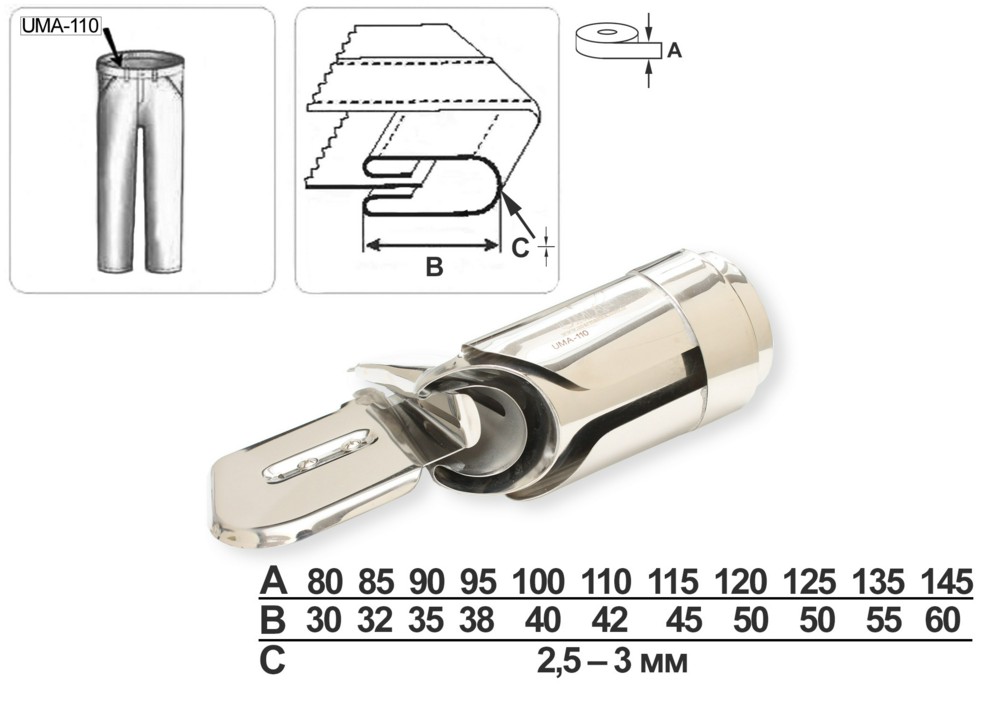 Приспособление UMA-110 для формирования (4 сложения) и притачивания пояса на джинсы. Приспособление устанавливается на поясные машины и предназначено для работы с умеренно тяжелыми и тяжелыми материалами.