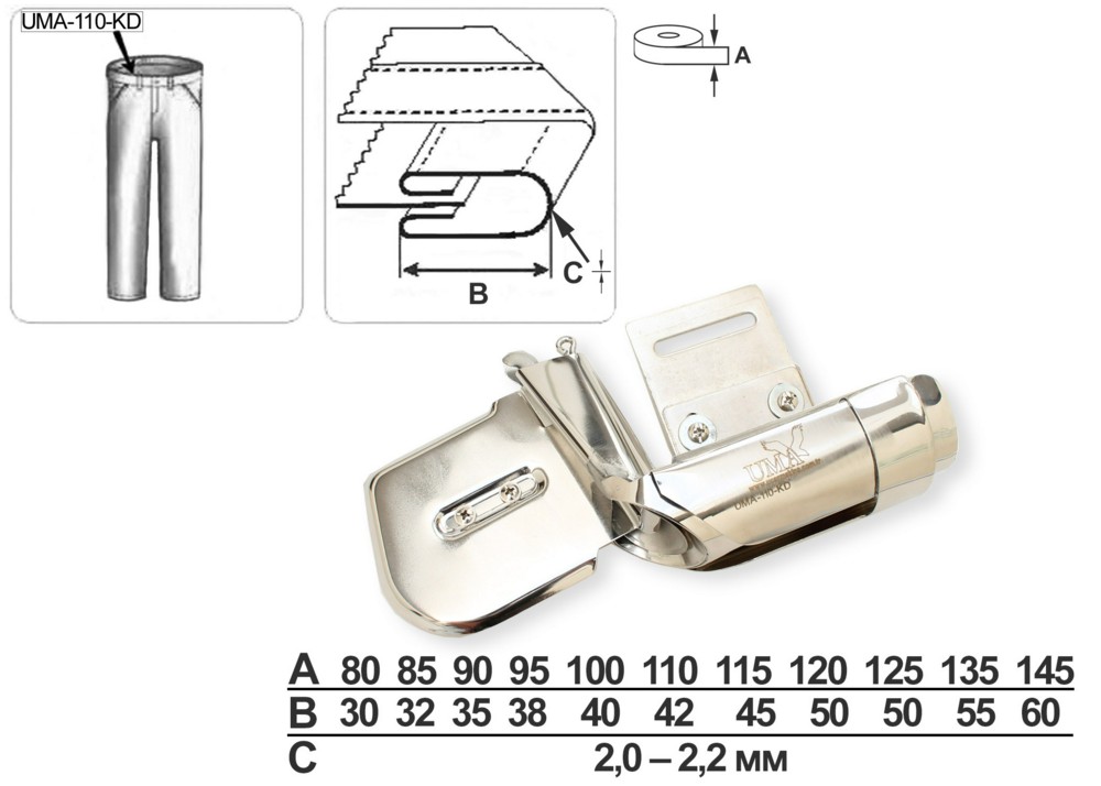 Приспособление UMA-110-KD для притачивания поясов на брюках из тонкой ткани окантовочным швом с закрытыми срезами. Устанавливается на поясные машины, подходит для работы со средними и умеренно тяжелыми материалами.
