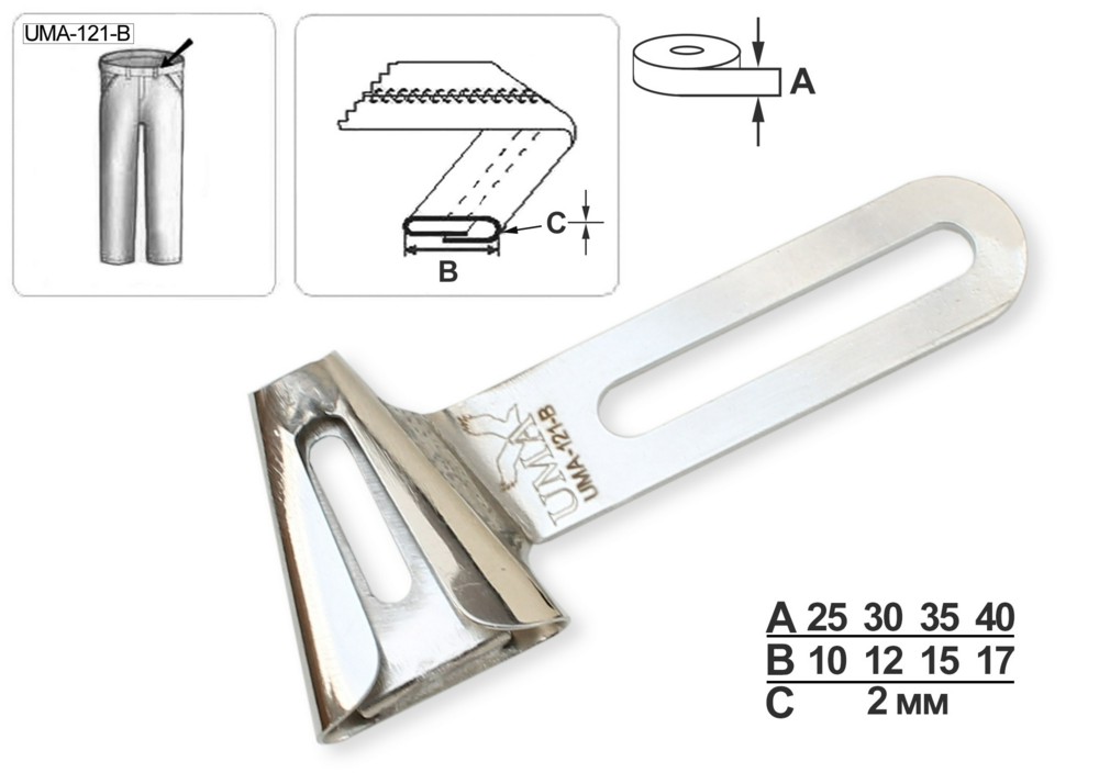 Приспособление UMA-121-B для изготовления шлевок, продольные срезы шлевок укладываются встык. Устанавливается на шлевочные машины, предназначено для работы с умеренно тяжелыми и тяжелыми материалами.
