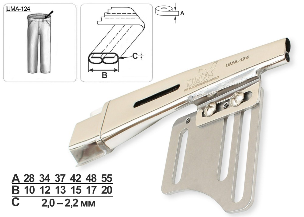 Приспособление UMA-124 для изготовления шлевок. Срезы подгибаются вдвое, внутренние сгибы располагаются встык по центру шлевки. Приспосбление устанавливается на двухигольные прямострочные машины, подходит для работы со средними и умеренно тяжелыми материалами.