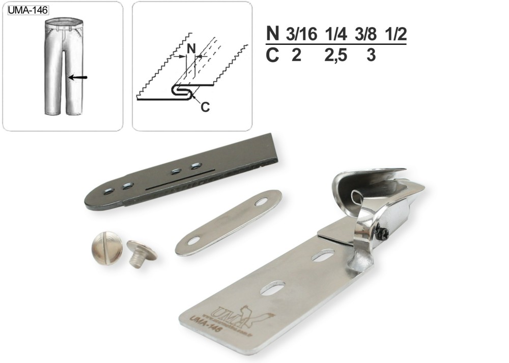 Приспособление UMA-146 предназначено для соединения деталей швом взамок на 2- и 3-игольных промышленных машинах с П-образной платформой. Предназначено для работы со средними и умеренно тяжелыми материалами. Приспособление используется для выполнения боковых и шаговых швов на брюках.