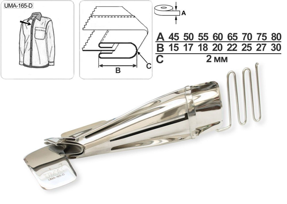 Приспособление UMA-165-D для формирования (4 сложения) и притачивания пояса брюк из тонких тканей. Приспособление устанавливается на прямострочные машины, для работы рекомендуется использовать пуллер, специальную лапку, зубчатую рейку и игольную пластину.