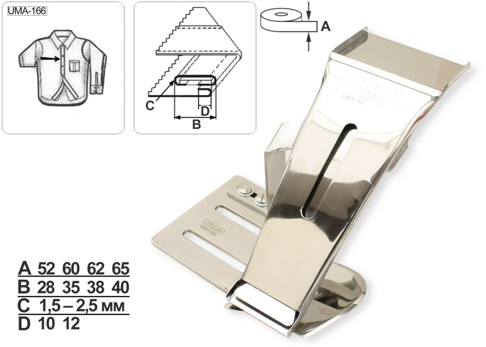 Приспособление UMA-166 для настрачивания планки под застежку (бейка с закрытыми срезами) с одновременным вкладыванием прокладочной полоски. Устанавливается на двухигольные прямострочные швейные машины со встроенным пуллером. Подходит для работы с материалами средней толщины.