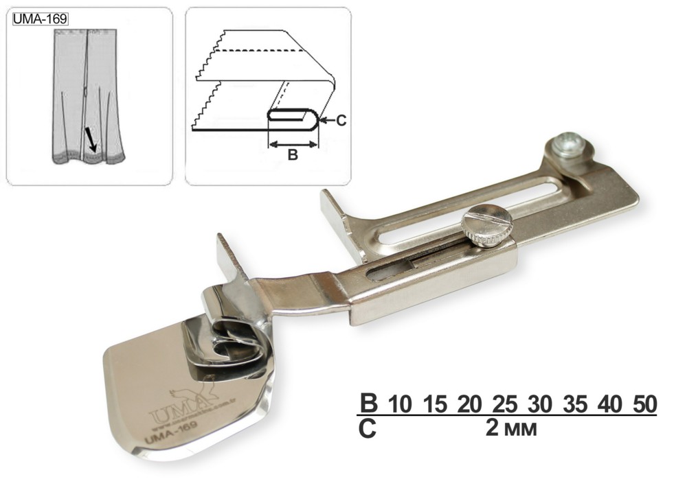 Приспособление UMA-169 10 мм L предназначено для обработки цельнокроеной планки под застежку, подгибки низа рукавов, а также обработки края покрывал швом вподгибку с закрытым срезом на одноигольной прямострочной швейной машине. Подходит для легких тканей.