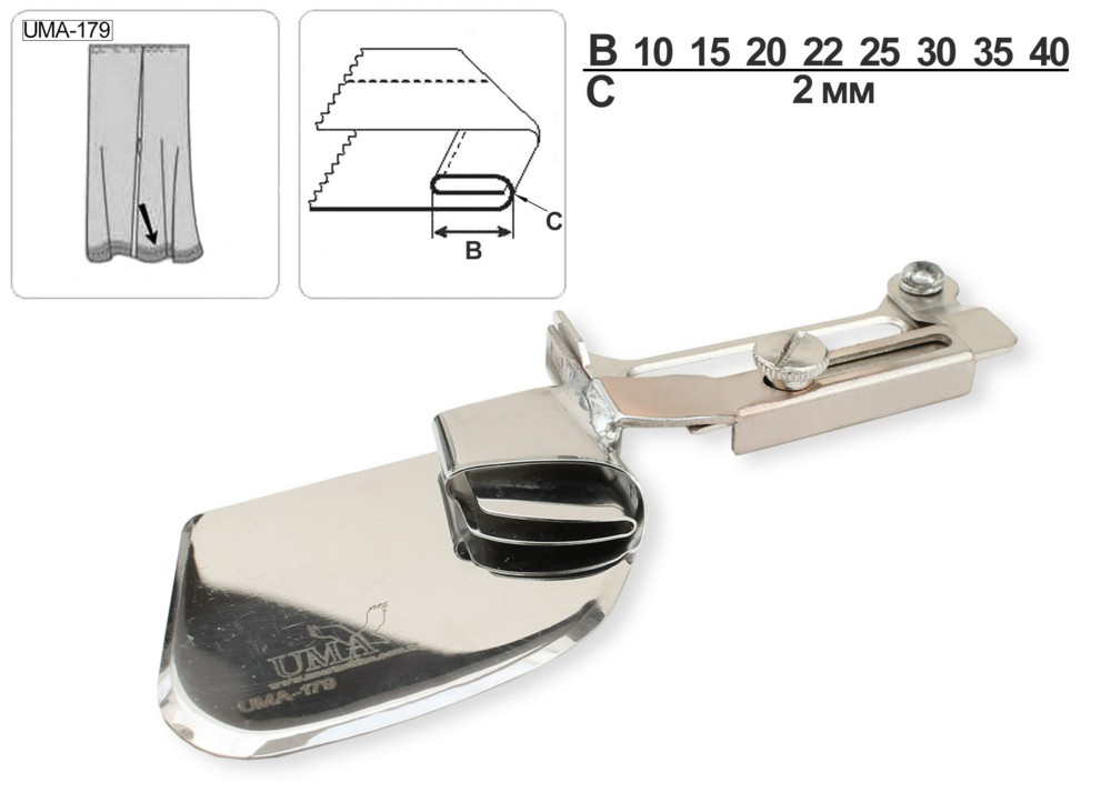Приспособление UMA-179 для выполнения шва вподгибку с закрытым срезом на постельном белье, подушках, покрывалах и т.п. Устанавливается на прямострочные машины с пуллером и реечным продвижением.