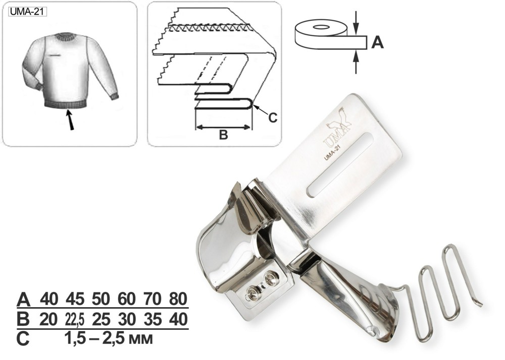 Приспособление UMA-21 с направителем для выполнения накладного шва с закрытым срезом (с кантом) на плоскошовной машине с плоской платформой.