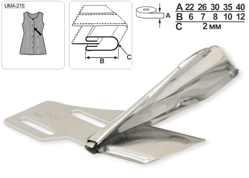 Приспособление UMA-215 для выполнения окантовочного шва бейкой/тесьмой с закрытыми срезами (в 4 сложения). Используется для обработки прямых срезов изделий. Устанавливается на прямострочные одноигольные швейные машины. Подходит для работы с материалами средней толщины.