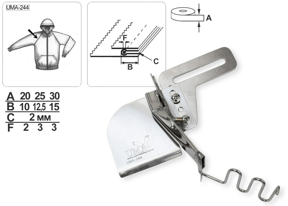 Приспособление UMA-244 для выполнения стачного шва с одновременным формированием и вкладыванием канта со шнуром. Устанавливается на прямострочные машины, предназначено для работы со средними материалами.