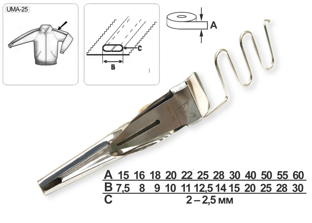 Приспособление UMA-25 45–22,5 мм для нашивания тесьмы/бейки в качестве лампасов с подгибкой продольных срезов. Приспособление предназначено для плоскошовных