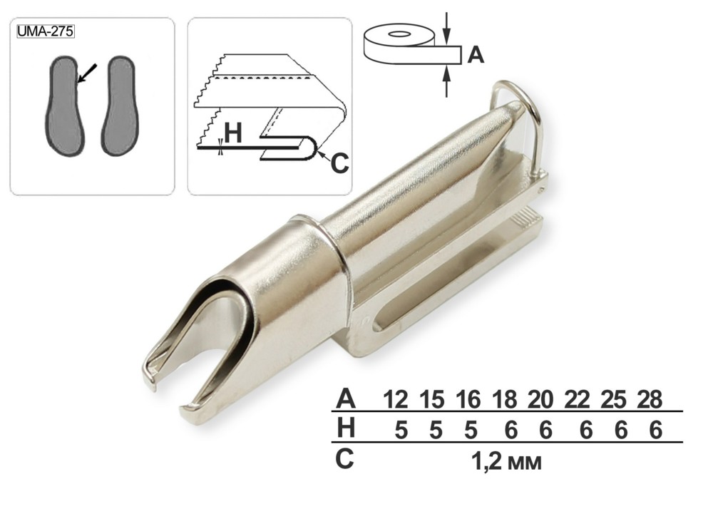 Универсальное приспособление UMA-275 для окантовки. Предназначено для прямострочных машин с шагающей лапкой, одноигольных машин с цилиндрической платформой и шагающей лапкой.