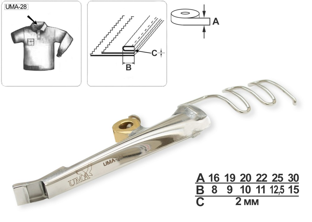 Приспособление UMA-28 для формирования и втачивания плоского канта (2 сложения) в шов соединения воротника и горловины на футболках поло. Приспособление устанавливается на прямострочные машины, рекомендуется использовать зубчатую рейку для притачивания тесьмы и специальную лапку.