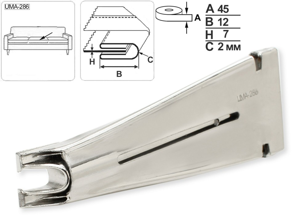 Приспособление UMA-286 для окантовывания диванных подушек. Устанавливается на швейные машины с шагающей лапкой и механизмом обрезки нити. Подходит для работы с умеренно тяжелыми материалами.