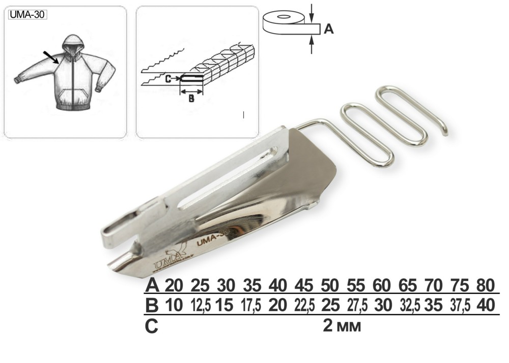 Приспособление UMA-30 25–12,5 мм с направителем для формирования и втачивания плоского канта (без шнура). Приспособление подходит для оверлоков марок Brother, Yamato, Siruba, Juki, Pegasus, используется при пошиве брюк, футболок, толстовок.