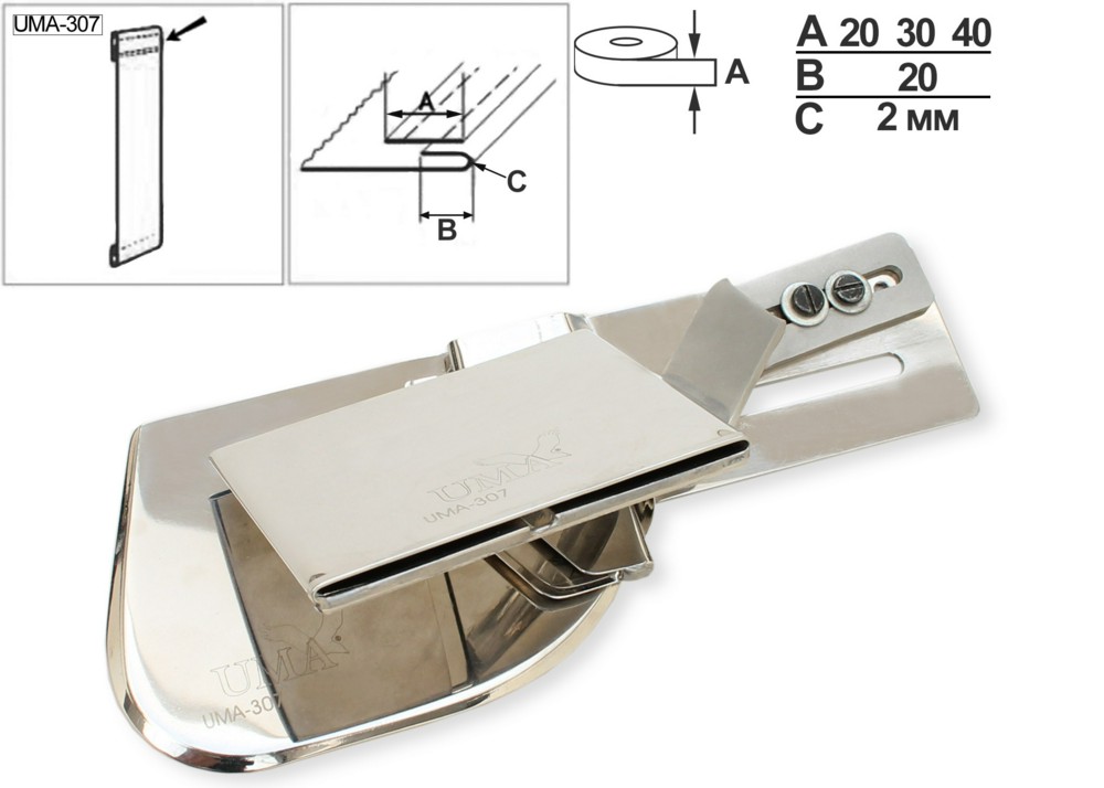 Приспособление UMA-307 для выполнения шва вподгибку с открытым срезом с одновременным накладыванием шторной ленты на тканой основе. Устанавливается на многоигольные швейные машины, подходит для работы с материалами средней толщины.
