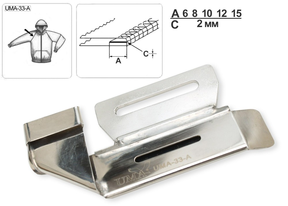Приспособление UMA-33-A предназначено для втачивания плоского канта в соединительный шов. UMA-33-A устанавливается на оверлоки марок Brother, Yamato, Siruba, Juki, Pegasus, рекомендуется использовать лапку для притачивания канта. Приспособление подходит для материалов средней толщины. Используется для отделки швов при изготовлении одежды.