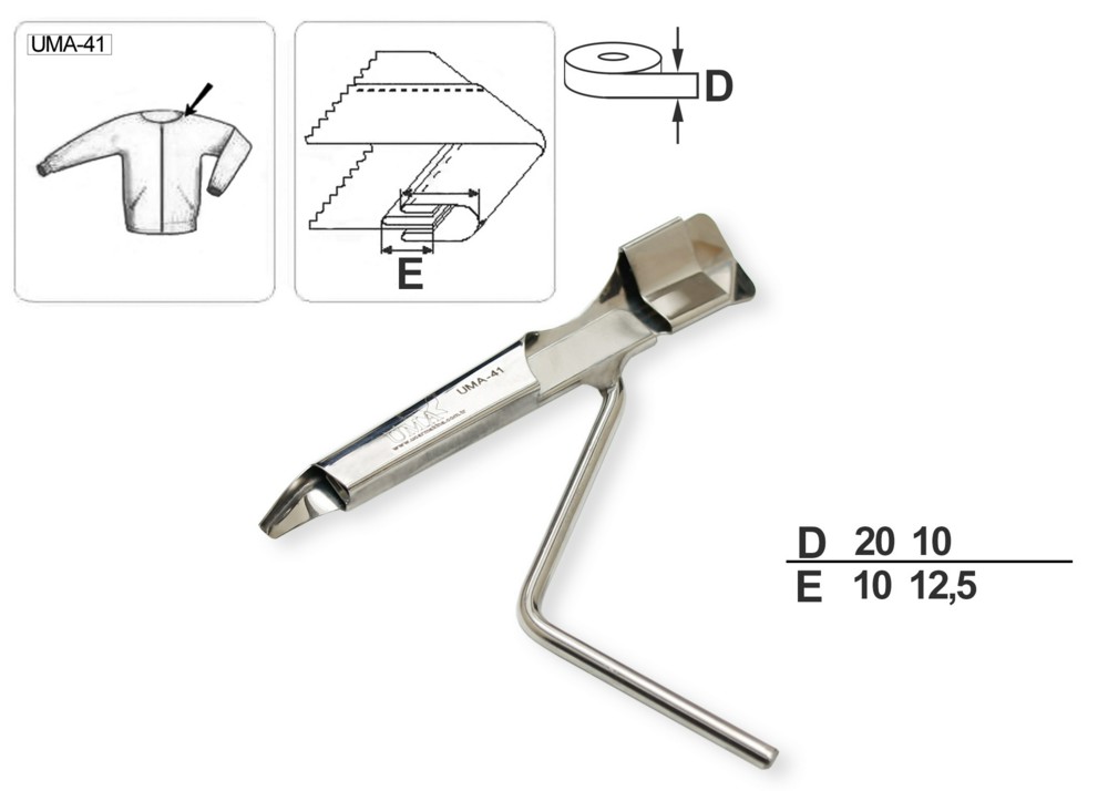 Приспособление UMA-41 25–7 x 20–10 мм предназначено для формирования плоского канта (тесьма/бейка в два сложения), который подается сверху и втачивается в окантовочный шов бейкой/тесьмой в три сложения с закрытым срезом сверху или в четыре сложения с закрытыми срезами. Окантовочный шов выполняется окантовывателями K710 или K712 необходимого размера, которые крепятся к распошивальной машине с вырезом под окантовыватель или с плоской платформой соответственно. Для крепления (пайкой) приспособления UMA-41 к окантовывателям K710 и K712 используется специальный держатель (см. крепление для UMA-41).