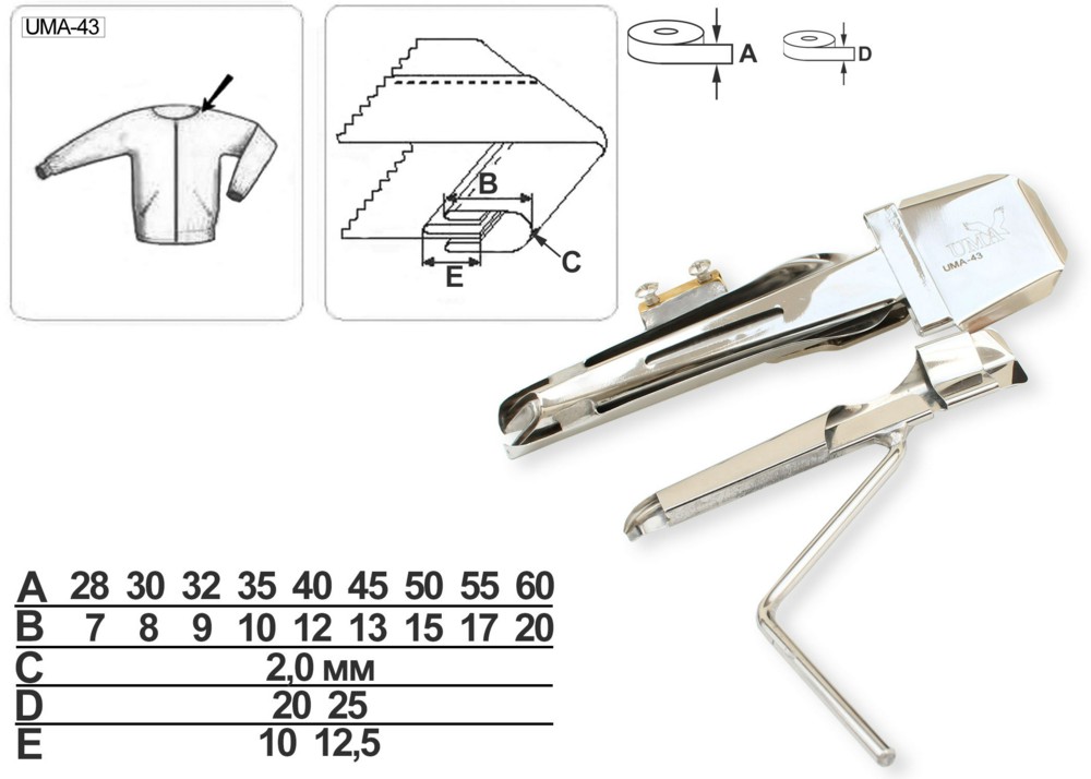 Приспособление UMA-43 предназначено для окантовывания открытых срезов горловины и рукавов бейкой в 4 сложения (с закрытыми срезами) с одновременным вкладыванием плоского канта. Устанавливается на плоскошовные машины с вырезом под окантовыватель, предназначено для работы с материалами средней толщины.