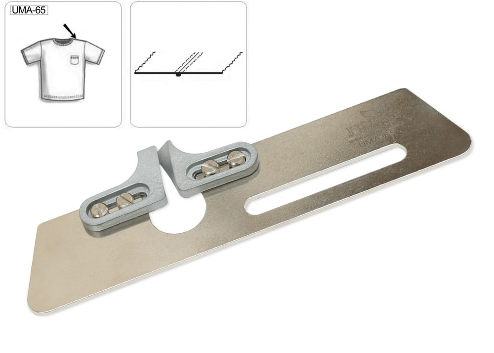 Приспособление UMA-65 предназначено для распошивания оверлочного шва на распошивальных машинах с плоской платформой. Направляющие шва регулируются под толщину слоев материала. Приспособление подходит для тонкого и среднего трикотажа.