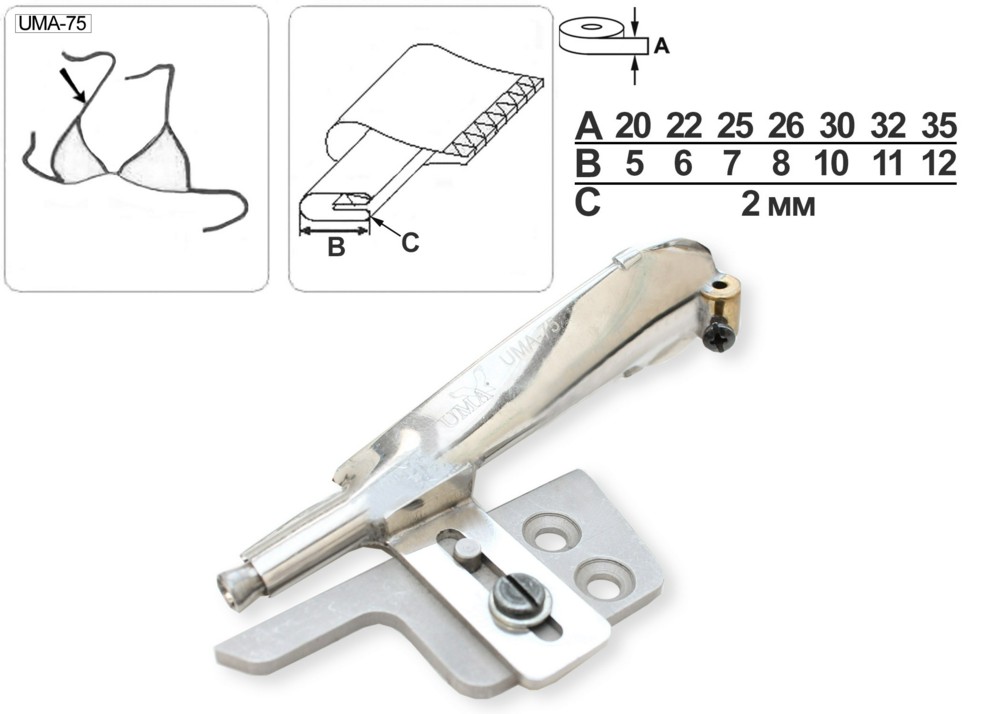 Приспособление UMA-75 для изготовления тонких бретелей путем соединения продольных срезов бейки обметывающей строчкой. Устанавливается на оверлоки марки Siruba. Используется при пошиве купальников и нижнего белья. Подходит для материалов средней толщины.