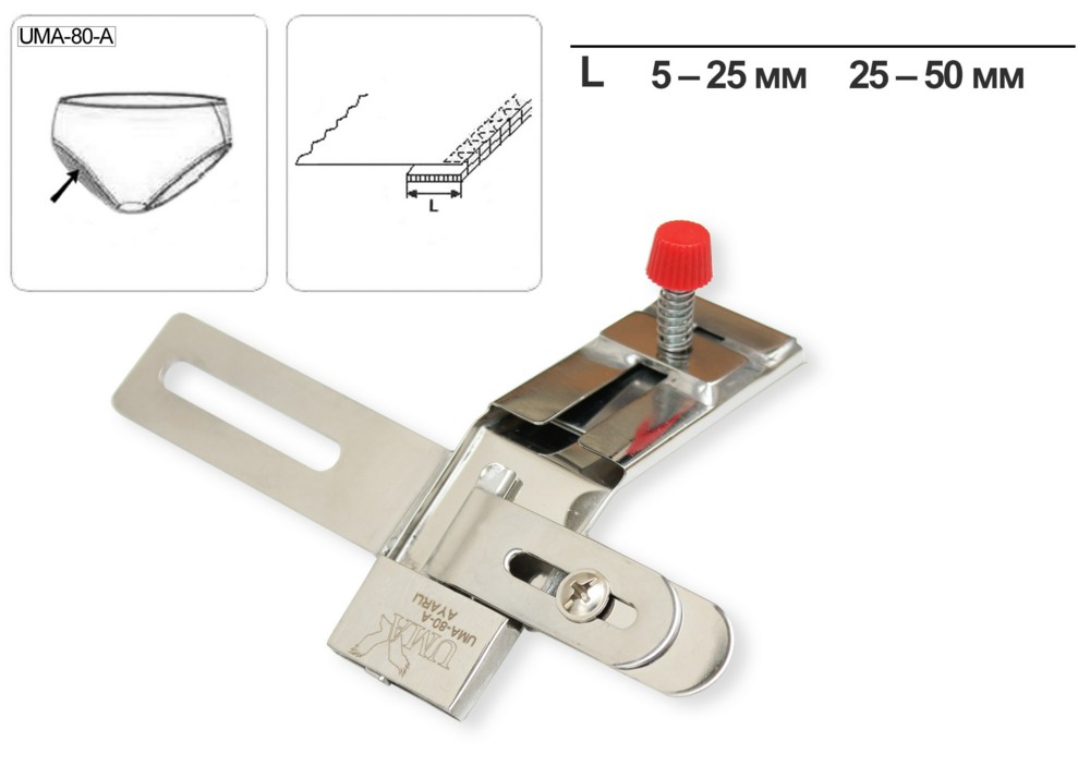 Приспособление UMA-80-A для притачивания эластичной ленты на нижнее белье и одежду для купания с возможностью настройки под ширину эластичной ленты и регулировки ее прижима (натяжения). Подача эластичной ленты осуществляется снизу, эластичная лента пришивается на изделие снизу.