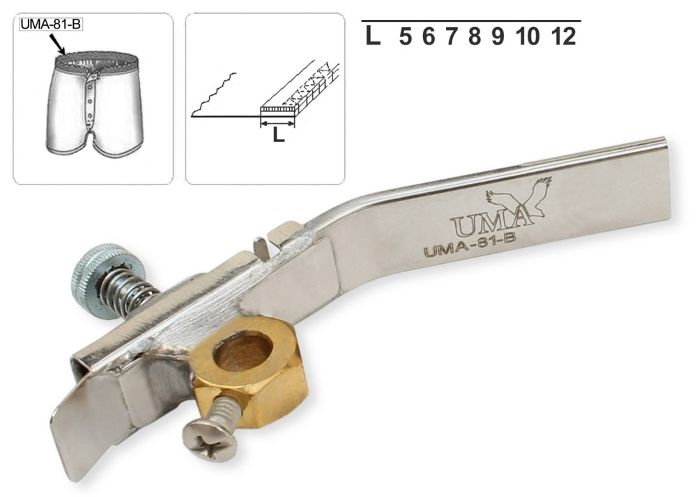 Приспособление UMA-81-B для притачивания эластичной ленты с одновременным обметыванием открытых срезов. Регулировка под ширину эластичной ленты отсутствует. Устанавливается на промышленные машины зигзагообразной строчки, оверлоки марок Brother, Yamato, Siruba, Juki, Pegasus и плоскошовные машины с плоской платформой.