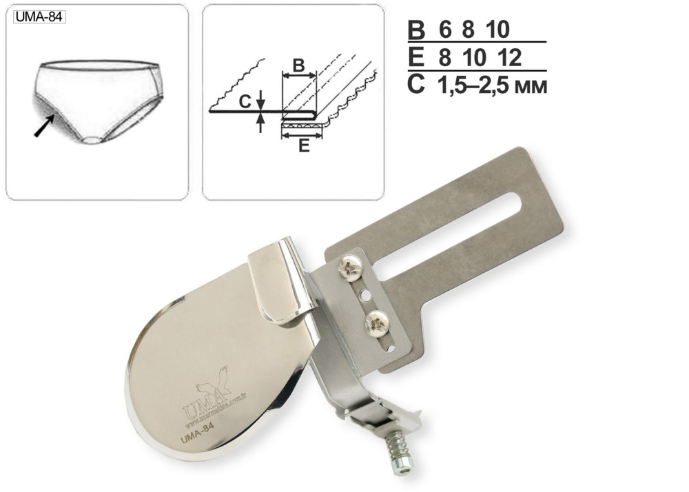 Приспособление UMA-84 для подгибания прямых и криволинейных срезов изделий из материалов средней толщины и одновременного притачивания эластичного кружева под подогнутые срезы. Приспособление предназначено для установки на плоскошовные машины с плоской платформой и используется для производства нижнего белья и купальников.