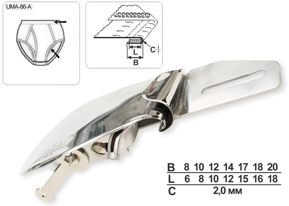 Приспособление UMA-86-A для выполнения шва вподгибку с открытым срезом снизу с одновременным вкладыванием эластичной ленты. Приспособление устанавливается на плоскошовную машину с плоской платформой и предназначено для работы с материалами средней толщины.