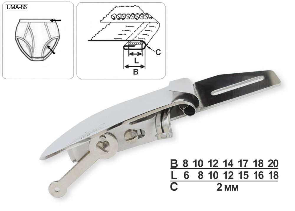 Приспособление UMA-86-B предназначено для обработки края изделий швом вподгибку с закрытым срезом с одновременным вкладыванием эластичной ленты на плоскошовной машине с плоской платформой. Край подгибается вниз.