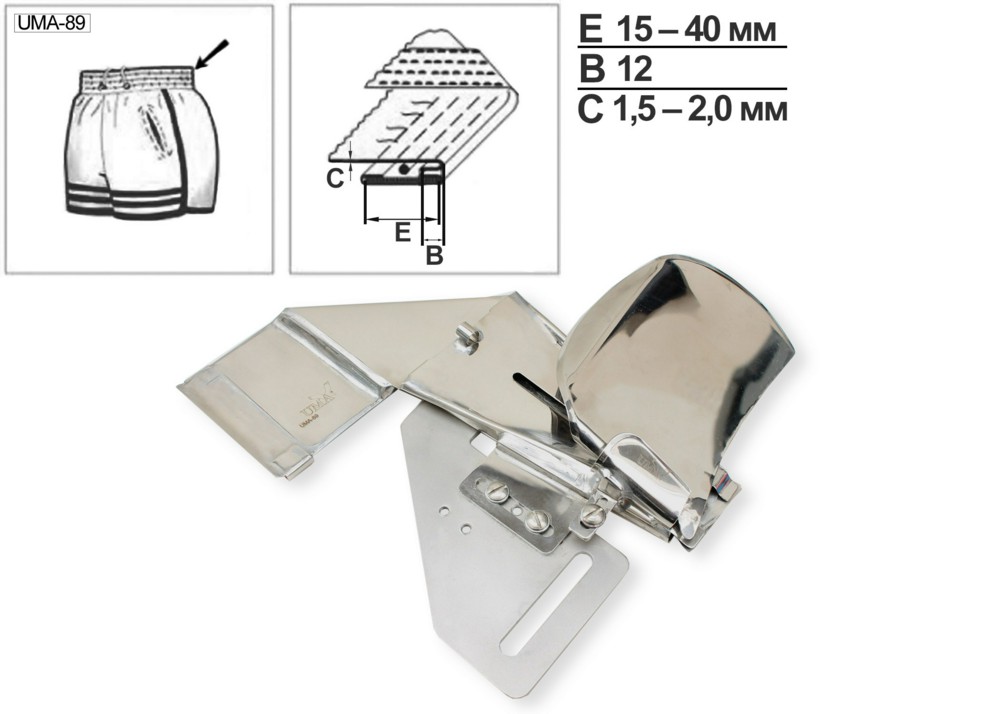 Приспособление UMA-89 для настрачивания бейки с закрытыми срезами с одновременным вкладыванием эластичной ленты и шнура при изготовлении поясов на спортивной одежде. Устанавливается многоигольные швейные машины. Подходит для работы со средними и умеренно тяжелыми материалами.