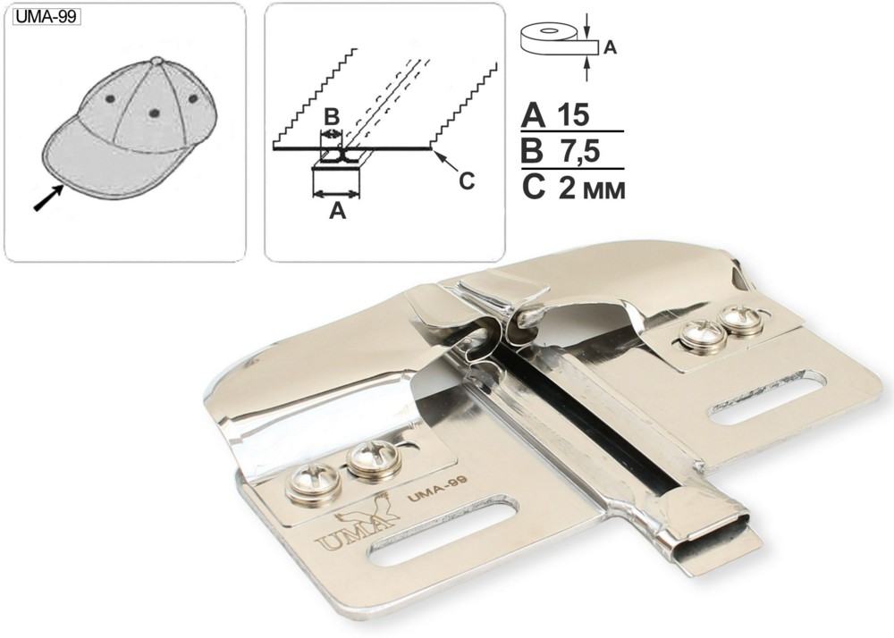 Приспособление UMA-99 для выполнения шва встык с одновременным прокладыванием тесьмы. Устанавливается на двухигольные прямострочные машины, предназначено для обработки материалов средней толщины. Приспособление используется при пошиве бейсболок.