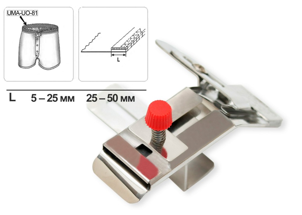 Приспособление UO-81 для притачивания эластичной ленты на нижнее белье и одежду для купания с возможностью настройки под ширину эластичной ленты и регулировки ее прижима (натяжения). Подача эластичной ленты осуществляется сверху, эластичная лента пришивается на изделие сверху.